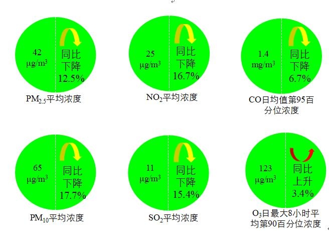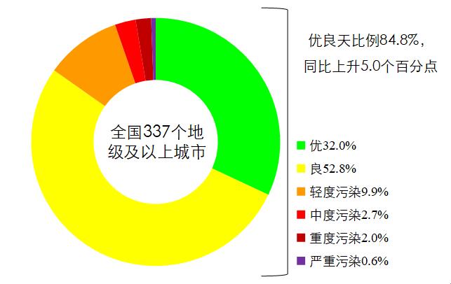 1-4月,全國337個地級及以上城市平均優(yōu)良天數(shù)比例為84.8%,同比上升5.0個百分點;129個城市環(huán)境空氣質(zhì)量達(dá)標(biāo),同比增加26個;PM2.5濃度為42微克/立方米,同比下降12.5%;PM10濃度為65微克/立方米,同比下降17.7%;O3濃度為123微克/立方米,同比上升3.4%;SO2濃度為11微克/立方米,同比下降15.4%;NO2濃度為25微克/立方米,同比下降16.7%;CO濃度為1.4毫克/立方米,同比下降6.7%。