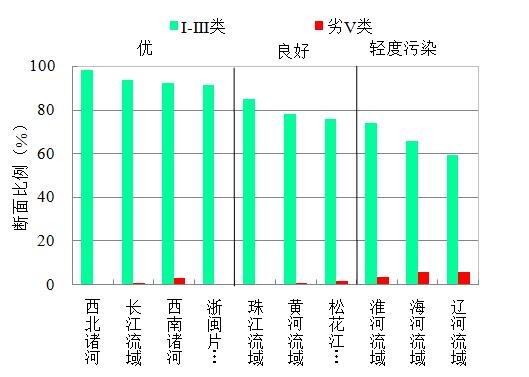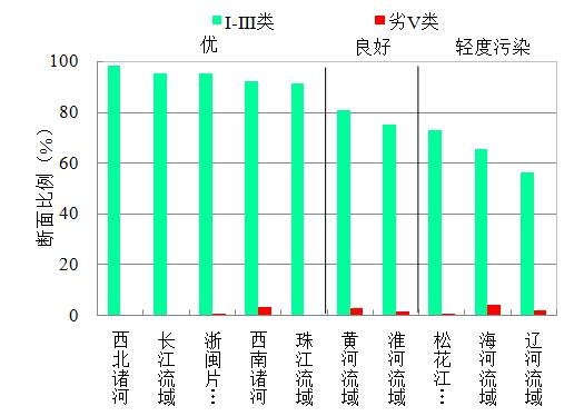 1-4月,長江、黃河、珠江、松花江、淮河、海河、遼河等七大流域及西北諸河、西南諸河和浙閩片河流Ⅰ-Ⅲ類水質(zhì)斷面比例為84.5%,同比上升7.2個百分點;劣Ⅴ類為1.2%,同比下降4.9個百分點。主要污染指標(biāo)為化學(xué)需氧量、高錳酸鹽指數(shù)和氨氮。其中,西北諸河、長江流域、浙閩片河流、西南諸河和珠江流域水質(zhì)為優(yōu),黃河和淮河流域水質(zhì)良好,松花江、海河和遼河流域為輕度污染。
